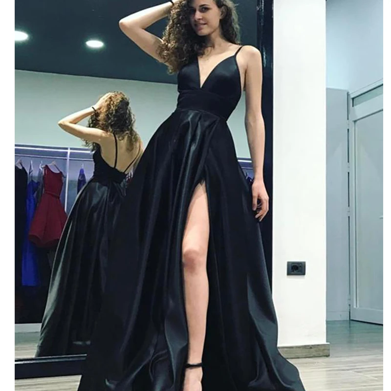 Exclusive Beautiful Spaghetti Straps Black Satin High Slit A Line Women Formal Evening Dresses Gowns