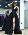 Best savings for Beautiful Spaghetti Straps Black Satin High Slit A Line Women Formal Evening Dresses Gowns